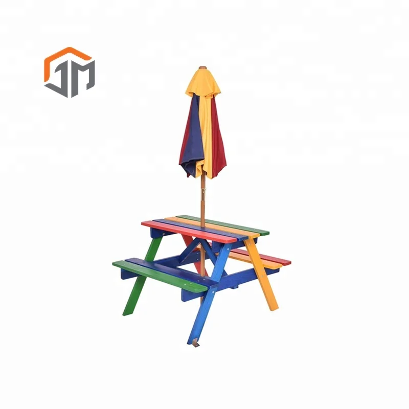 This kids picnic table can be used as a play table or picnic table. Four children can sit comfortably for social play and interaction. Can install an umbrella, this picnic table is perfect for your kids to enjoy their meals or snacks outdoors. Give your child a space of their own in your backyard to eat, play and relax with this 4-piece wood picnic set. This Picnic Table Set is made by durable wood which features solid structure. Light but tough, corrosion resistant material extends its service time for several years.