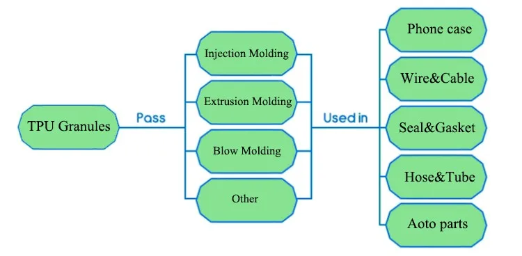 Widely used in phone case, Auto parts, machinery parts, shoes sole and accessories, film, wire&cable, hose&tube,seal&gasket, elastic tape, straps, Air-bag and so on.