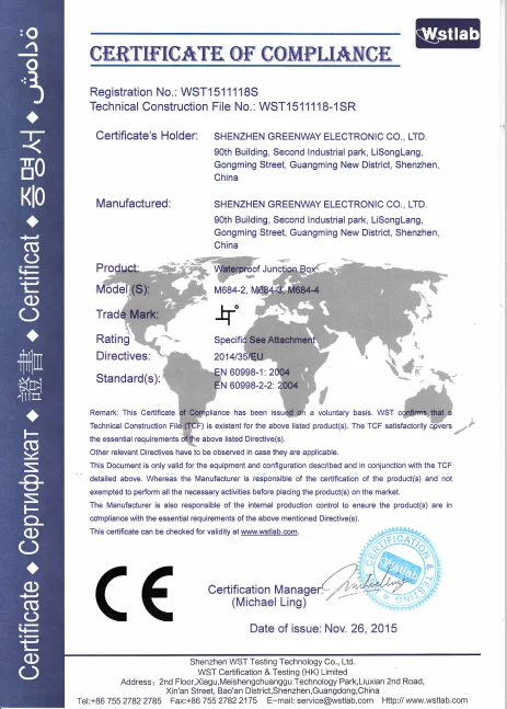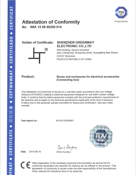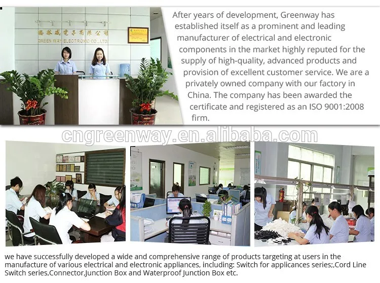 Shenzhen Greenway Electronic Co., Ltd, one of the fastest growing company in China, is specialized in making switches and connectors. Our products mainly includes appliances switch series, cord line switch series, wire connector series, outdoor lamp terminal box series, surge protective devices series, waterproof junction box series. Our products are popular in China and also sold to Europe and the United States, Southeast Asia, the Middle East and other countries with high appreciation. Greenway insist to the principle of "orienting by the people, winning in quality, doing honest bussiness, developing with innovation. Greenway focuses on improving technical strength to meet special need by our customers.