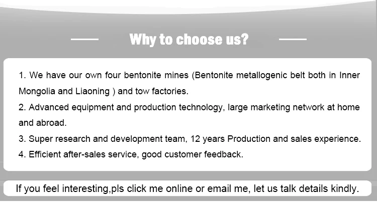 We have four owned Bentonite clay mines and two products factories, one of them keeps high montmorillonite content 95-98%, which is rare in world, so that we can ensure steady and high quality, also ensure the competitive price and delivery time.