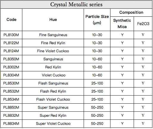 Below is our Crystal metallic series details .We also supply Crystal Silver white series,Crystal Gold series, Crystal series and also other natural mica basing pigments in other pages , welcome to enquiry!