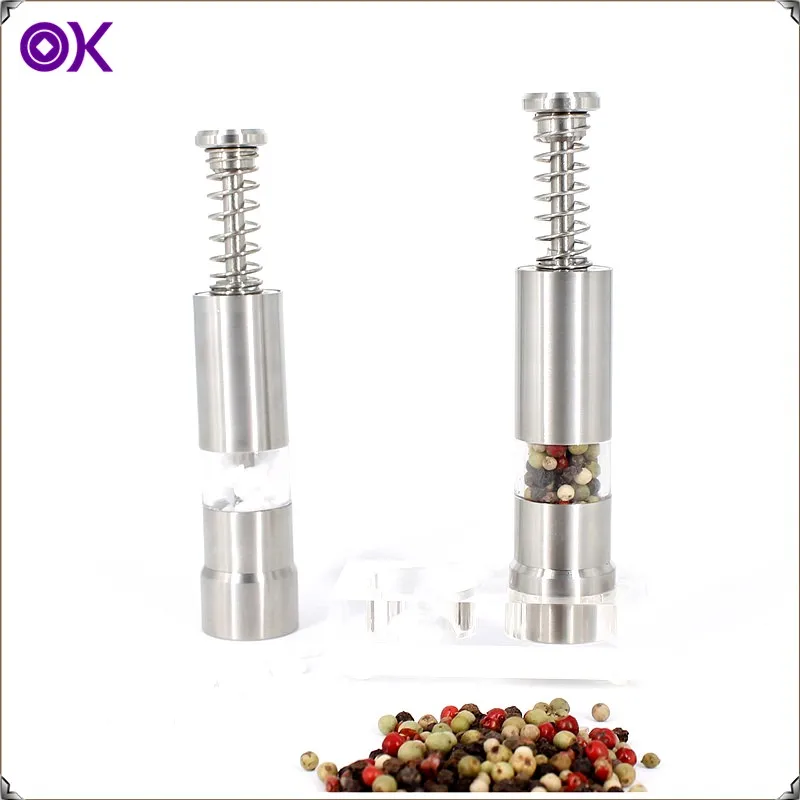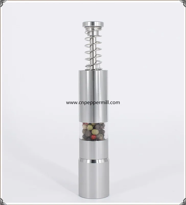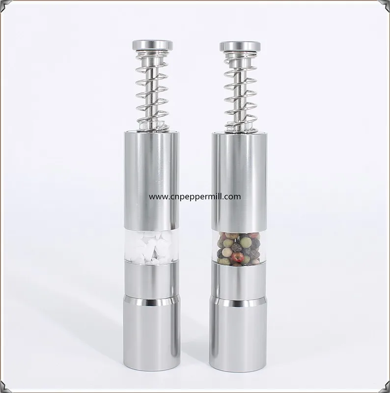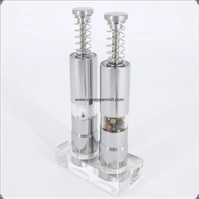 All these series works the same way, simply press the top button to send the grinding rod down through the contents of the mill to add fresh ground salt and pepper to any dish or recipe. Having more than one salt and pepper grinder in your home or kitchen makes daily life just a little easier. Keep a set of salt and pepper mills on the dining room table and another on the kitchen counter for easy access while cooking. These series can be ordered come with a acrylic mess-free stand/base to keep residual salt and pepper from messing up your countertop or table. Normally ordered as a set of 2 pcs, 1 can for salt use, the other for pepper use. We recommend ordering these items with color rubber coating, that can make them easier to grip and adds a bit of color to your kitchen or dining room. We also recommend using small to medium salt granules, not overfilling them, so that the grinding rod has room to move and storing your salt and pepper in a freezer size plastic bag or container to allow for easy refilling. Simply remove the solid metal base, scoop in what you need and you are back in business! Easy to use, Easy to refill!