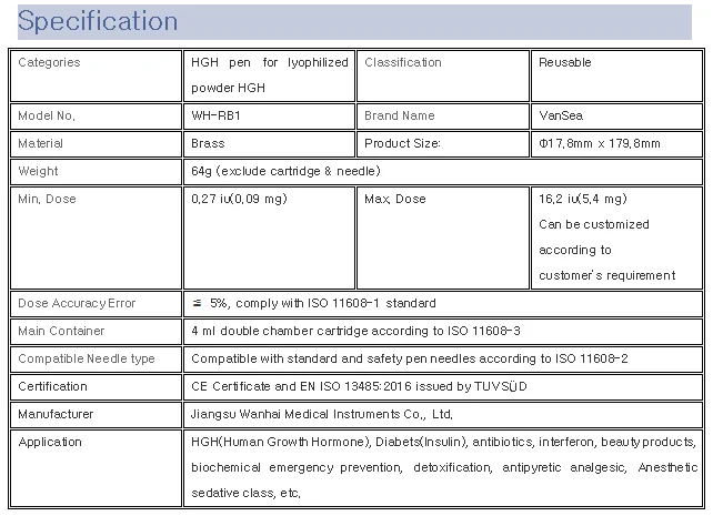Product Features Repeated use Dose adjustment is convenient, adjustable range 0~15 IU (0~5.4mg) Minimum Single dose 0.25 IU (0.09mg); Injection of high precision, the error is less than 5%; A variety of needle-compatible replacement convenient; Applicable 4 ml double chamber cartridge Lyophilized powder injection.