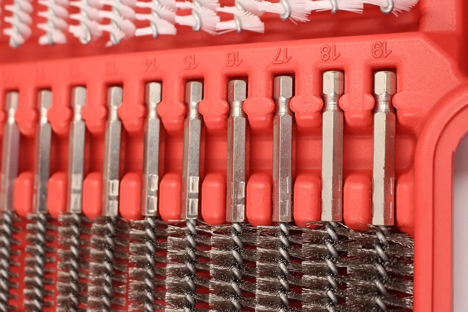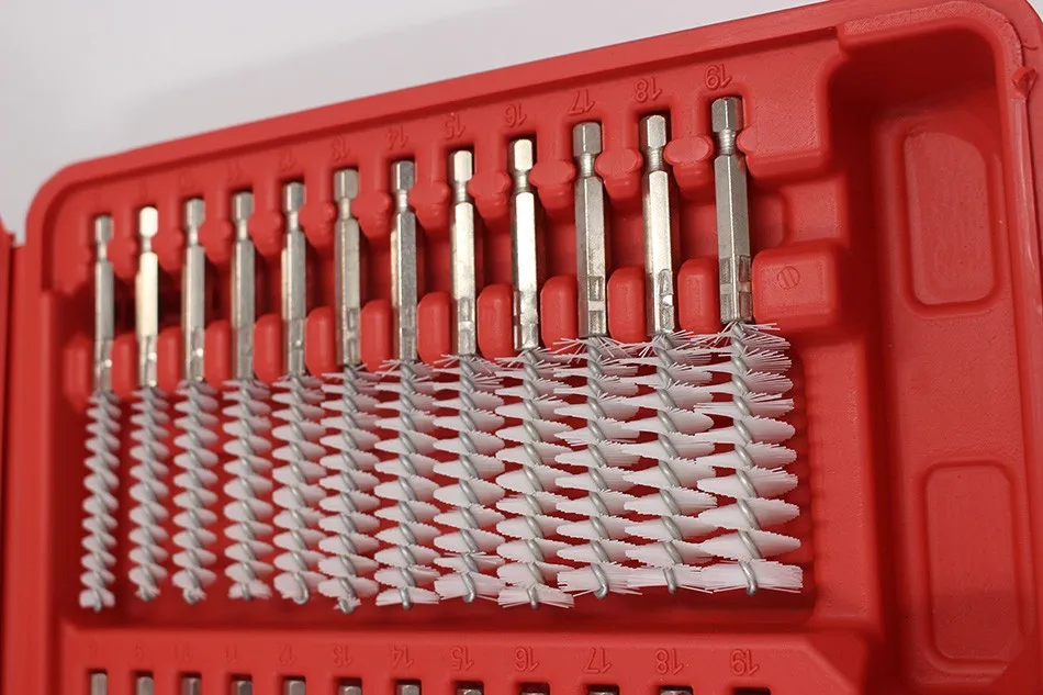 Brush sizes: 8-9-10-11-12-13-14-15-16-17-18-19 mm (5/16, 11/32, 13/32, 7/16, 15/32, 1/2, 9/16, 19/32, 5/8,11/16, 23/32, 3/4 inch)