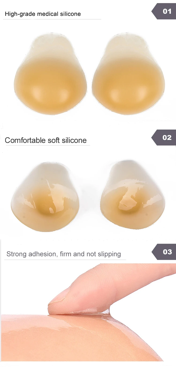 1.Uplift breasts.enhance cleavage. 2.Self-adhesive,backless,strapless 3.German high-purity crystal silicone with good elasticity,feels soft and comfortable. 4.Inner glue is antibacterial ,enviornment-friendly 5.Self-adhesive,washable ,resuable. 6.Safety tested.easy to use,clean and suitable for different skin 7.Perfect to be worn under backless ,halter or evening dresses. |