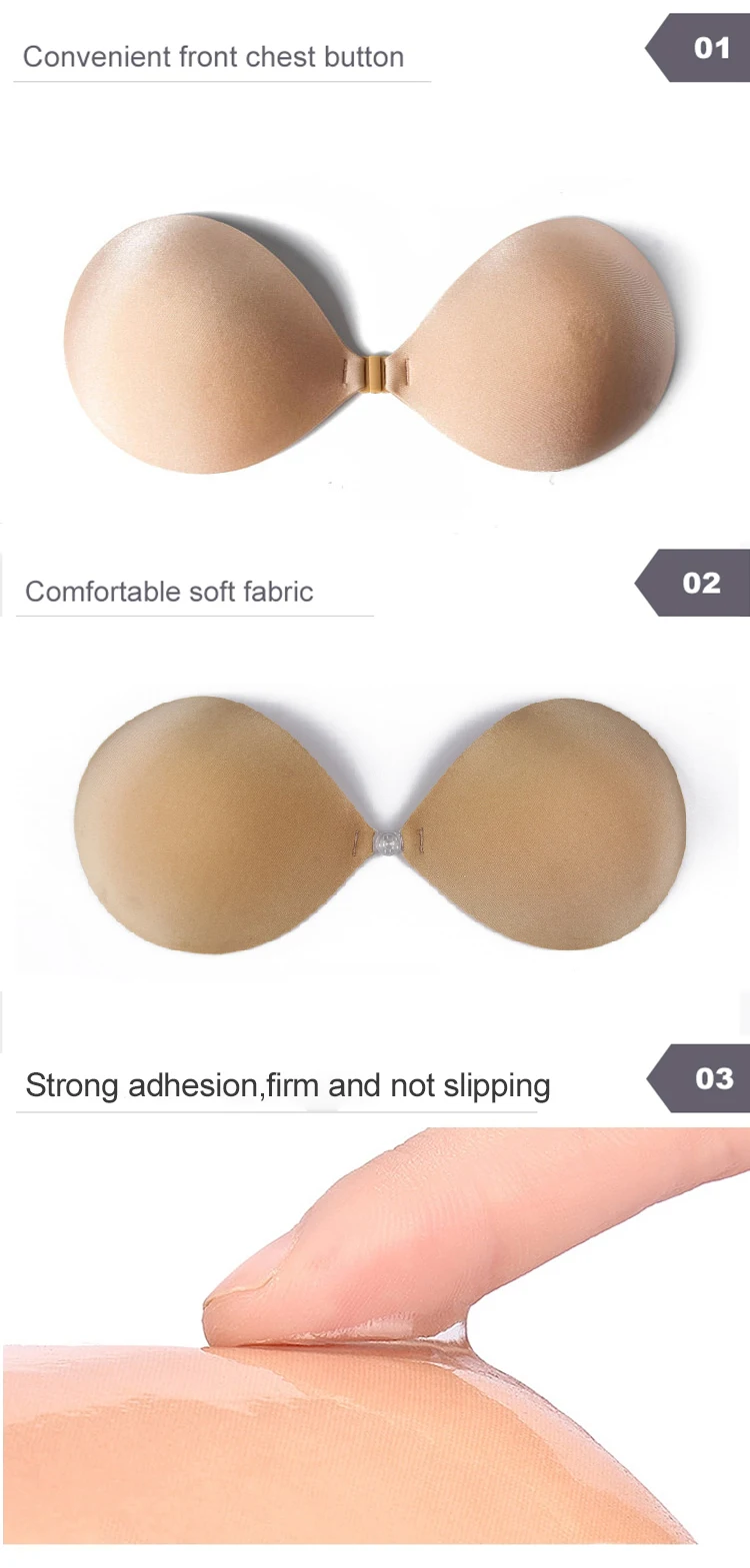 1.Uplift breasts.enhance cleavage. 2.Self-adhesive,backless,strapless 3.Inner glue is antibacterial ,enviornment-friendly 4.Self-adhesive,washable ,resuable. 5.Safety tested.easy to use,clean and suitable for different skin 6.Perfect to be worn under backless ,halter or evening dresses. |