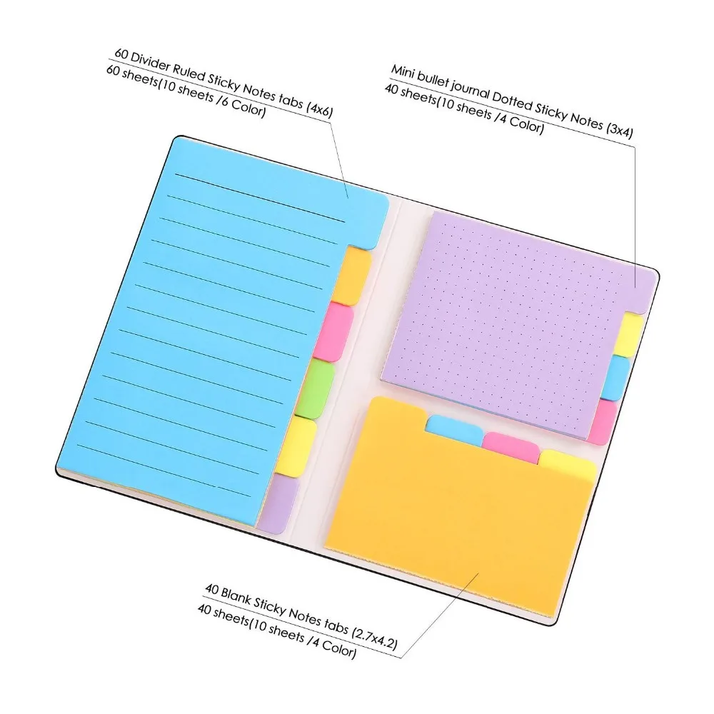 Description | 1. Bright colors and different sizes: 60 Ruled Notes with tabs, 40 Dotted Notes with tabs, 40 Blank Notes with tabs. | ||||