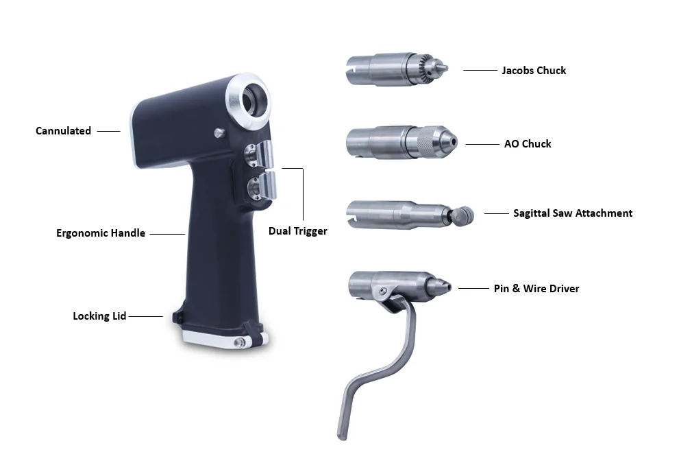Medical electric saw/drill series; Imported brush-less motor series; International high-quality brush-less motor series; Medical multifunctional bone saw/drill series; Specialized system for ankles; Specialized power for pedicle screws implantation; Specialize power for external fixation screws implantation etc.