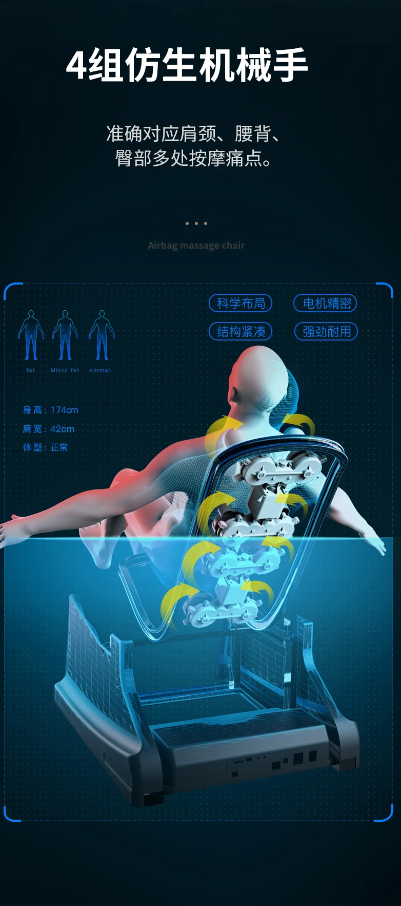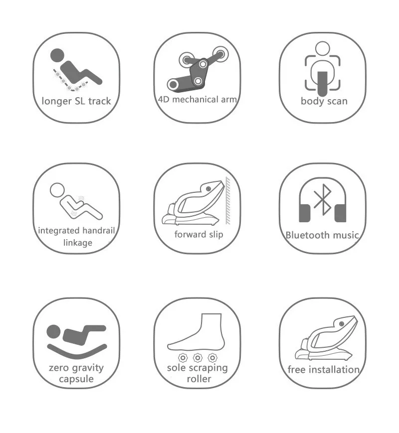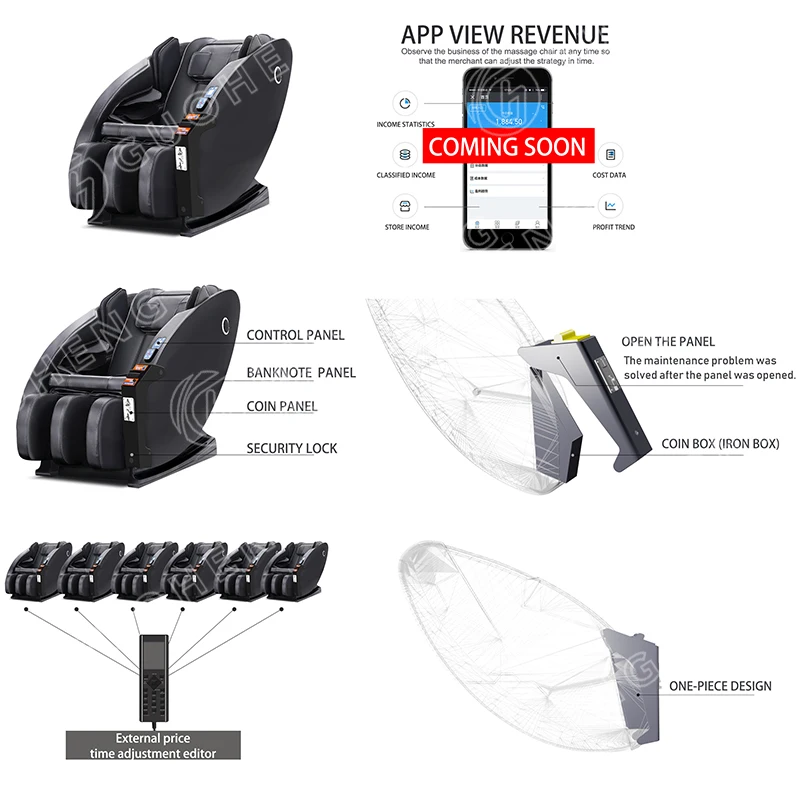 Functions | 1. 3d zero gravity design. 2. Air pressure for arm,shoulder and calf massage. 3. Vibrating at seat cushion. 4. 8 points or S rail massage feature.(2 features for choice) 5. Price and Time adjustment by yourself 6. APP Management System (Help you to manage your commercial massage chairs in real-time to know your revenue) | ||||