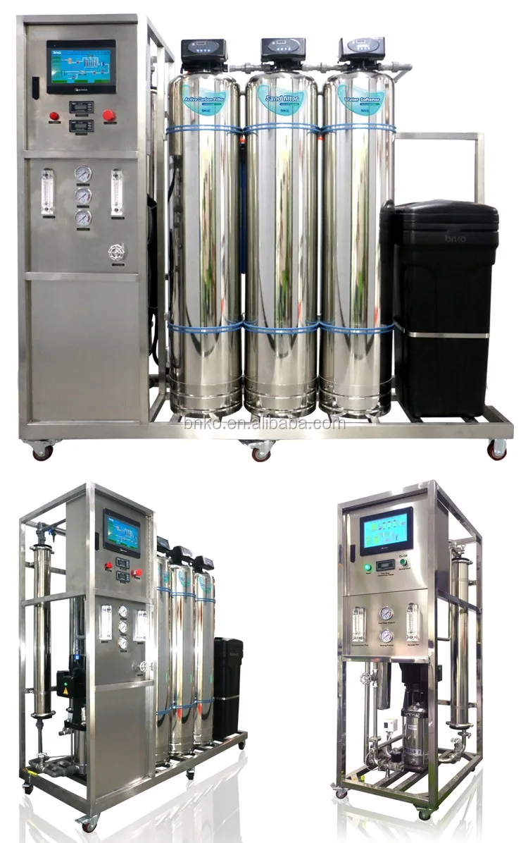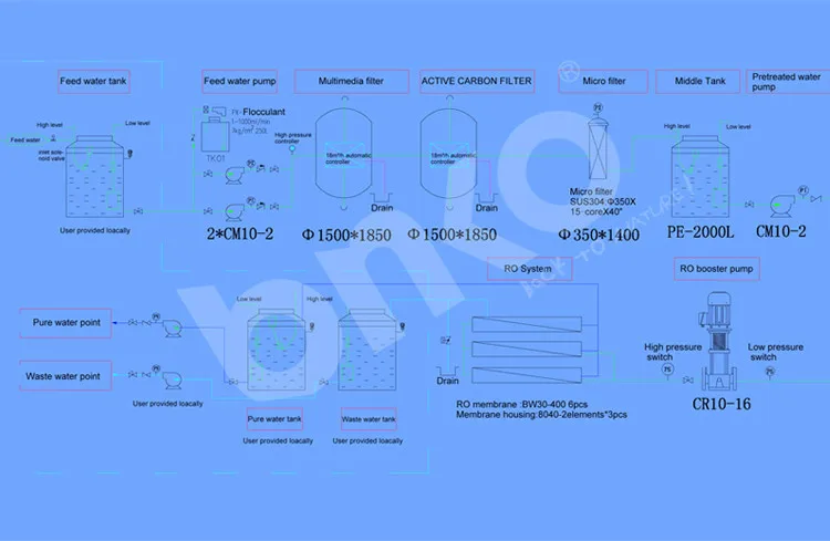 Raw water→ 1. Booster pump→ 2. Sand(multi-medium) filter→3. Active carbon filter→4. Softener (optional)→ 5. Security(micron) filter→6. High pressure pump→7. Reverse osmosis system→ 8. UV sterilizer (ozone generator) →Pure water storage tank
