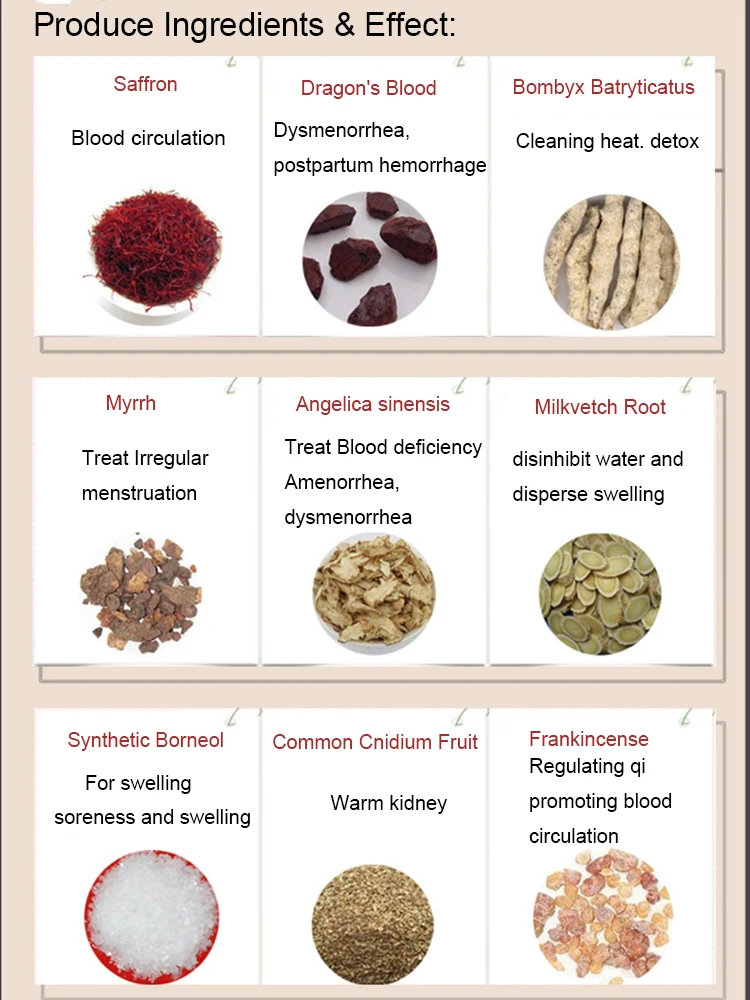 | Myrrh | Treatment of blood stasis, confidant pain, irregular menstruation, fever and heat, treatment of women with blood and blood, abdominal rib pain, sacral bones, numbness of hands and feet, skin itching |
