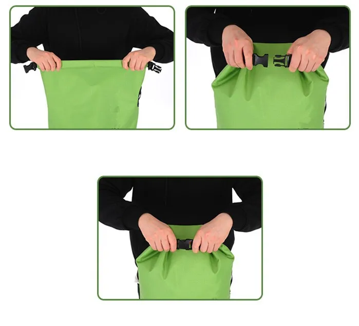 Easy Operation and Cleaning: Just put your gear in bag, grab top woven tape and roll down tightly 3 to 5 times and then plug buckle to complete seal, whole process is very quick. Dry sack is easy to wipe clean due to its smooth surface.