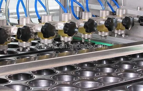 This machine is applied to the production of different cakes, such as cupcake and custard cake. Choose either oil sprayer or dispenser first, loading trays on the conveyor, they will automatically step-walks forward for oil spraying or paper cup loading, and then dough depositing. Then workers take the trays into rotary oven for baking. After baking, the workers load the trays with baked cakes on the machine for cream injection and depanning. After depanning, the empty trays move to oil sprayer for another circular production.