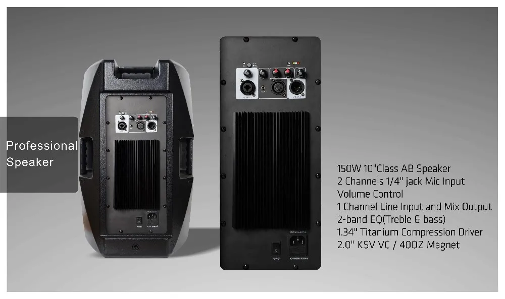 2 Channels 1/4" jack Mic Input/Volume Control 2-band EQ(Treble & bass) 10 inch steel frame woofer rubber surround available paper cone cloth edge 2.0KSV voicel coil 40OZ magnet Stronge plastic handle more easy transport Dual angle design perfect for use as stage monitor