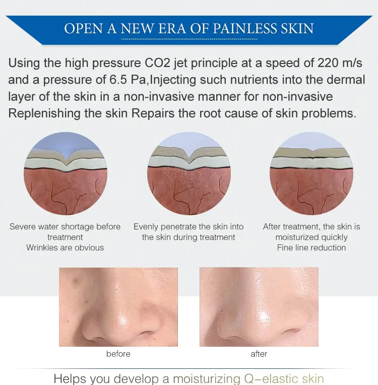 The technology included CO2 high-pressure injection, combined with an extremely high concentration of atomized actives at a very low temperature and through Non-needle painlessly inject essence to demal layer by high speed vibration frequency and jet spray. It is like implanted a piece of water-locked mask to te dermal layer to Promote cirulation within the skin and render water skin lihgtening effect. So as to achieve the effect of skin lifting,wrinkle removal,skin rejuvenation ect.