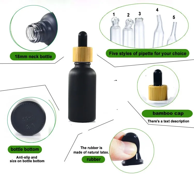 Name | 5ml 10ml 15ml 30ml 50ml 100ml matte frosted black essential oil glass bottle with dropper pump sprayer bamboo aluminum cap |