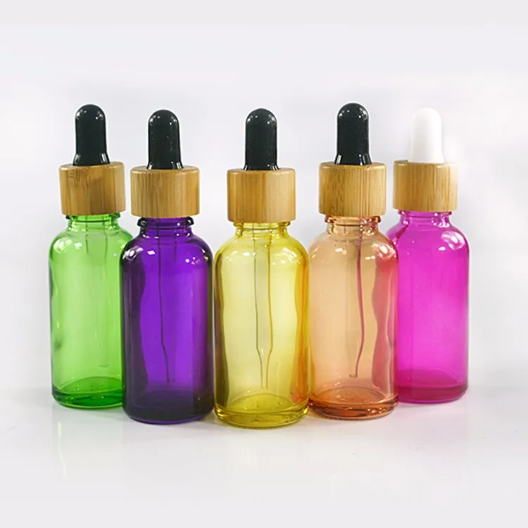 we have green blue clear clear pink purple color 5ml 10ml 15ml 20ml 30ml 50ml 60ml 100ml glass dropper bottle with bamboo lid