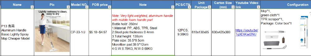1.Model No.# FP-10, Name: Spray Mop P4https://www.alibaba.com/product-detail/Brand-New-Classic-Spray-P4-for_60768911361.html?spm=a2747.manage.list.95.e81171d2nUdV0C