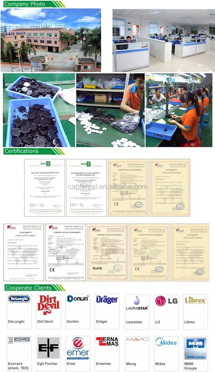 Retractable Cable Power Cord Rewinders for Vacuum cleaner, Carpet washer / shampooner, Mobile air conditioner, Power supply for medical, laboratory and office equipment,Steam cleaner, High pressure cleaner, Electrical mobile furniture, Stick cleaner, Steam iron, Lamp and power stand, Rechargable equipment, Mobile heaters, Mobile ventilators, Rice cooker, Food processor, Food slicer, Sewing machine, Meat mincer, Cooling box, Battery charger, Compact household appliances, Iron tation, Iron table, Electric white board, Medical movable bed, High pressure cleaner, Beamer, Floor care appliances...