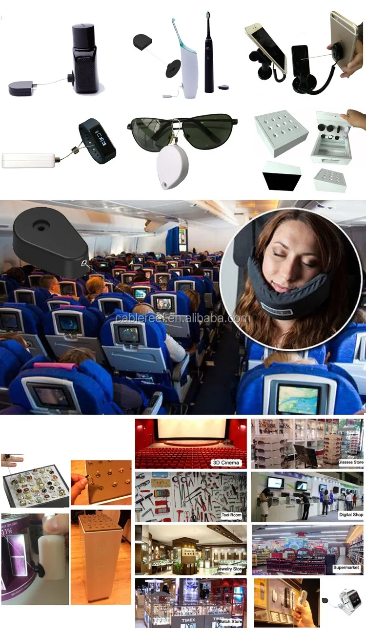 1) These are retractable device with sticker or toggle connecting the samples which effectively prevent showing products from being stolen in exhibition, supermarket and shops