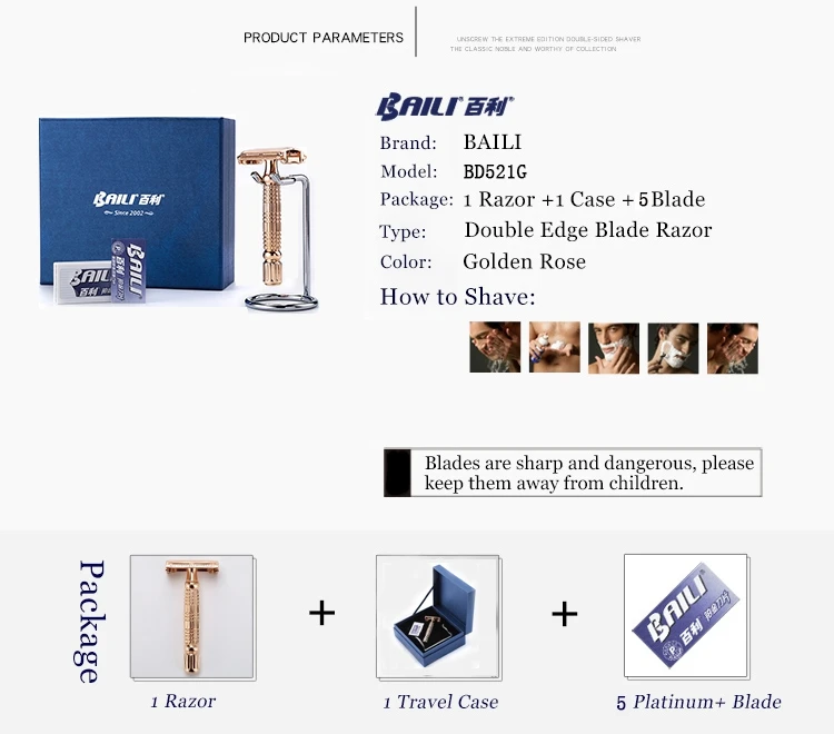 Q: Baili always focus on producing various of shaving product covering system razor, double edge razor, disposable razor, razor blade refill and other related products.