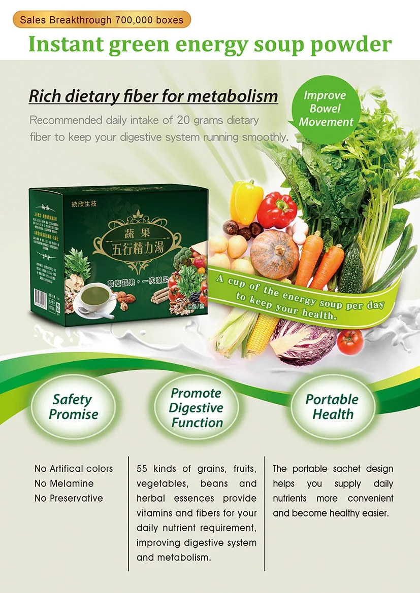 | \t Main Ingredient | \t Whole milk powder, Grain complex powder(wind, oat, black sesame, alfalfa, Rdece klasje, soybean, corn, millet, coarse rice, common buckwheat, black glutinous rice, adzuki bean, black soybeans, mung bean, dioscoreae rhizome, adlay), vegetable complex powder(Ashitaba, Pasture, Barley seedling, Sorghum, Black rice, Almond, Pumpkin, Lotus, Burdock, black sesame, Purple yam, Mushrooms, Alfalfa, Broccoli, Cabbage, Carrot, Spinach, Celery, Tomato), oat powder, green tea powder, guar gum, Herb extract powder r(Microcrystalline α-cellulose , corn starch, Rhodiola extract, Salvia root extract, Cassia seed extract, Roselle extract, Mulberry leaf extract, Nelumbinis Folium extract, Siraitia grosvenorii extract, Licorice extract), vitality hearb extract complex powder(Microcrystalline α-cellulose , corn starch, Red dates extract, Wolfberry extract, American ginseng extract, Astragalus extract, Licorice extract), Integrated juice powder(sugar, maltodextrin, pineapple, apple, orange, Passion fruit, Mandarin, mango, papaya, banana, lime, lemon, white grape, peach, blueberry, west Indian cherry, red grape), Vitamin B complex(maltodextrin, lactose, Vitamin B2, Vitamin B6, niacinamide, vitamin B1, calcium pantothenate, folic acid, biotin, vitain B12) |