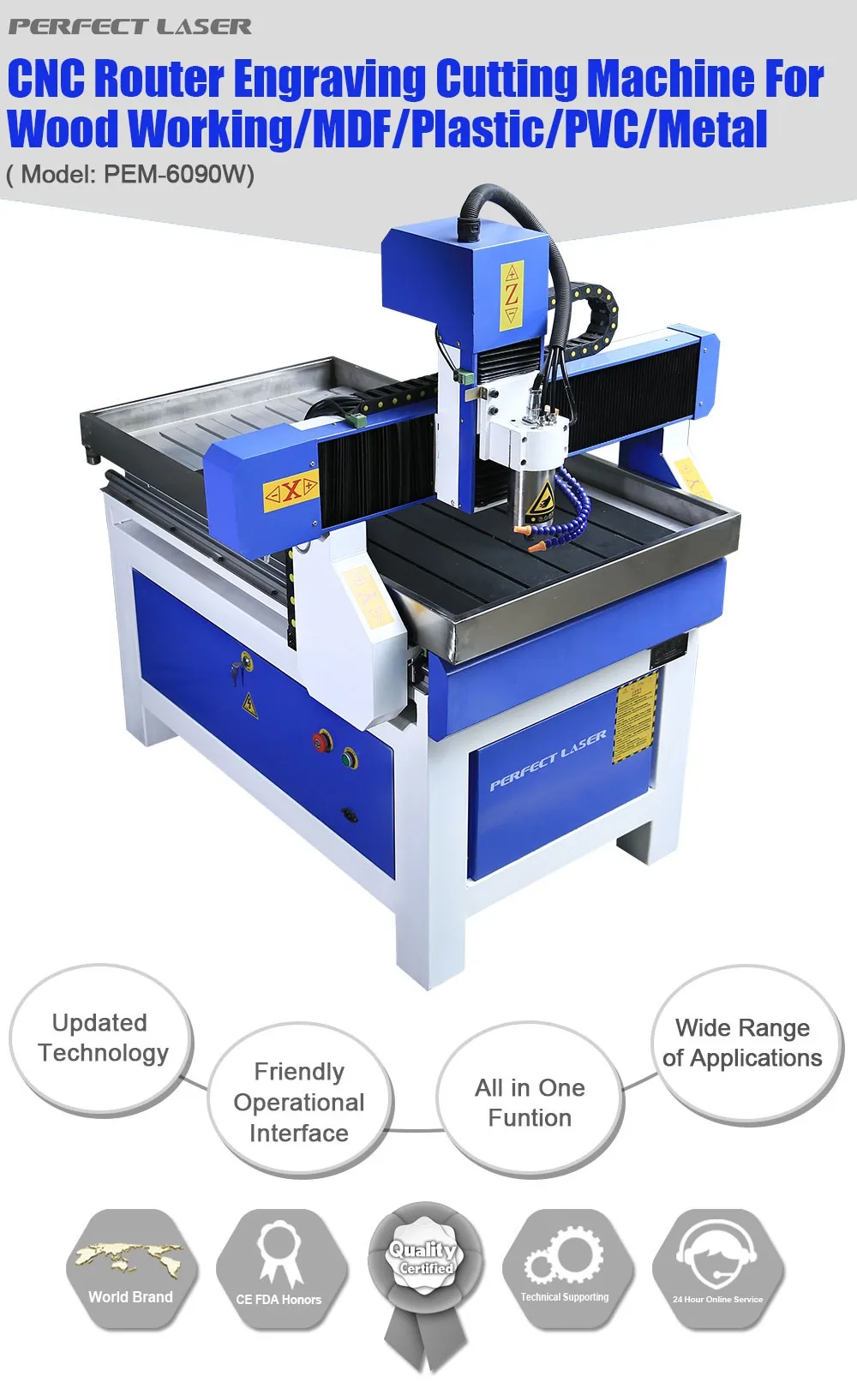 CNC router engraver PEM-6090W is a kind of 3 axis cnc router which is designed with pure aluminum, which ensures the parallelism and greatly increases the precision and speed of the engine bed.