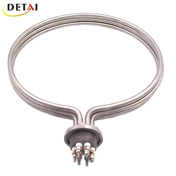 DETAI manufacture a varied range of flanged immersion heating element for direct immersion into water, oils, resins, food stuffs and many other liquids and gasses. A standard immersion heater consists of a number of robust hairpin shaped tubular heating elements welded with a flange.This type of unit gives simple, low cost installation, 100% heating efficiency generated within the solution, and minimum resistance to the circulation of solutions to be heated.
