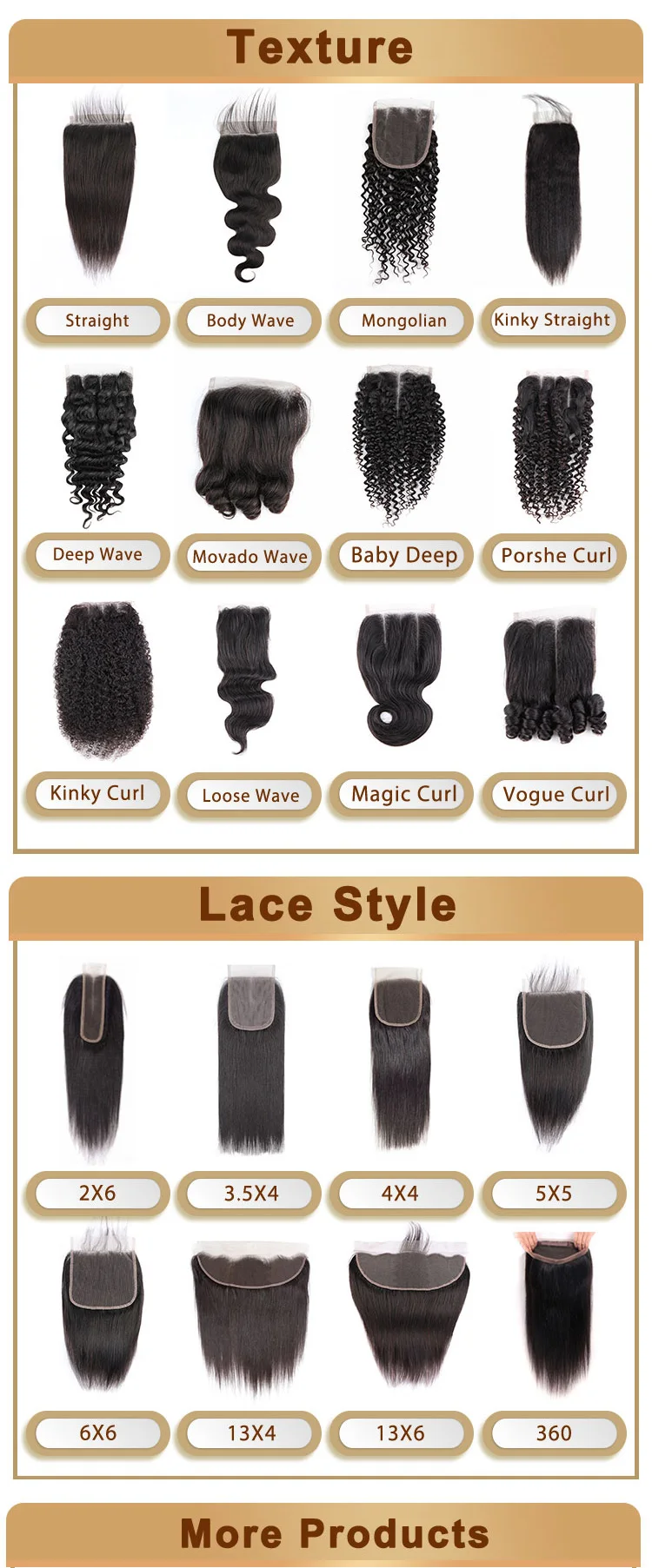 Style | Straight,Body wave | Straight,Body wave | Straight、Body wave、Deep wave、Mongolian curly、Baby deep、kinky/yaki straight、Funmi curl or Customized | |||||||||||||