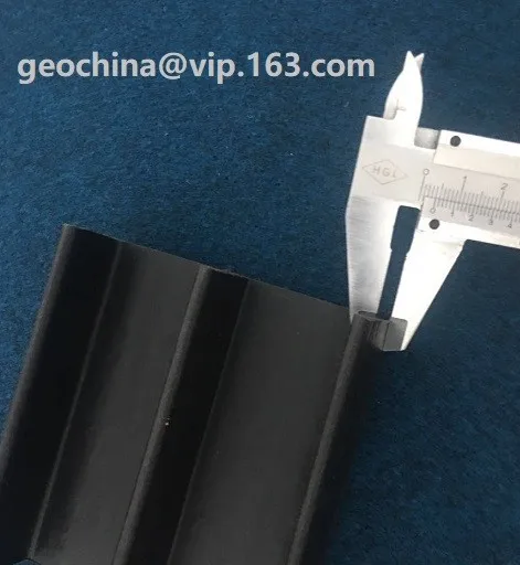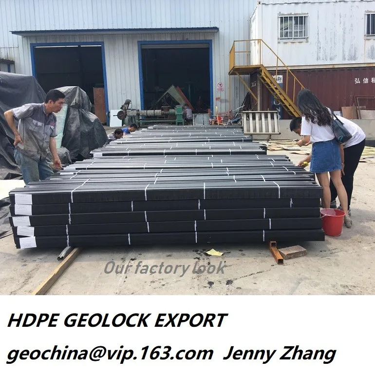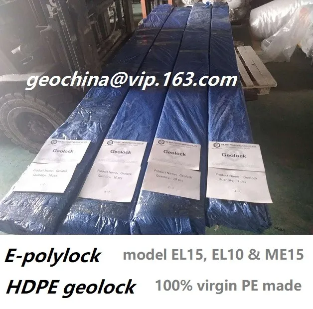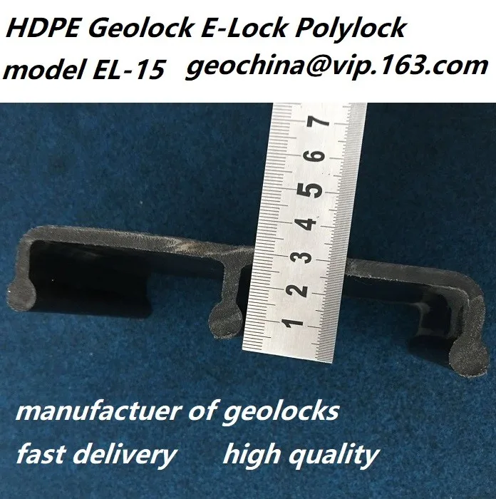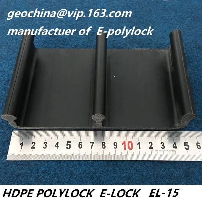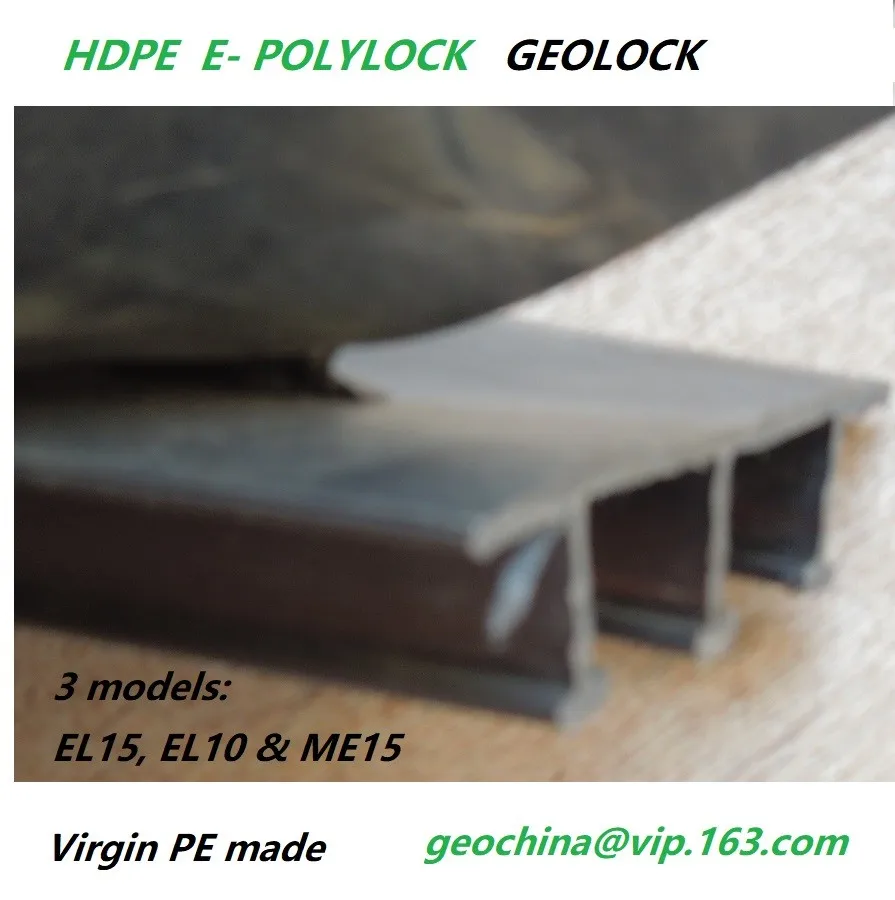 HDPE geolock s used for HDPE geomembrane attachment in construction. It is an extruded HDPE concrete emebedement strip with an E profile shape. The smooth surface with width 15cm or 10cm is for welding the polyethylene sheets while the 3-4cm height fingers are used to insert the web concrete to get locked-in and fix the joint with geomembrane to make a complete water-proof banking. It is also called E-lock or polylock. We produce 3 models of the geomembrane attaching use HDPE geolock by 100% virgin resins. EL15, with 15cm surface width and widest spread of fingers are popular in International market while EL10 is with 10cm surface width is the most econmic one with the smallest but still functional sizes stands stable in Chinese market. The third design is the ME15, which still owns the 15cm wide attachment surface but with a shrinked fingers to save some eight and make it more economic. Some customers are fond of ME15 due to its considerable marketing design.