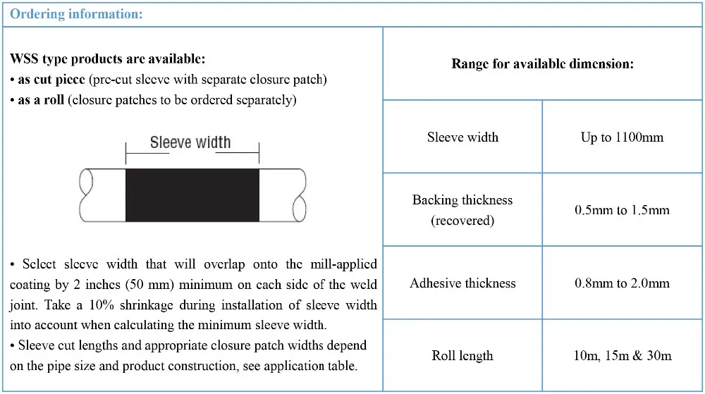 During installation, the epoxy primer is applied to the prepared pipe surface and the heat-shrinkable sleeve is immediately wrapped around the joint over the wet epoxy. Heat is then applied to the sleeve which shrinks to form a tight fit around the joint. While curing, the epoxy forms strong mechanical and chemical bonds to the pipe surface & to the copolymer adhesive layer. The radiation cross-linked outer layer forms a tough barrier against mechanical damage and moisture transmission.