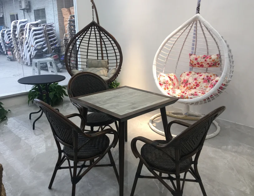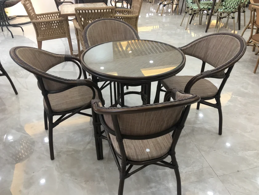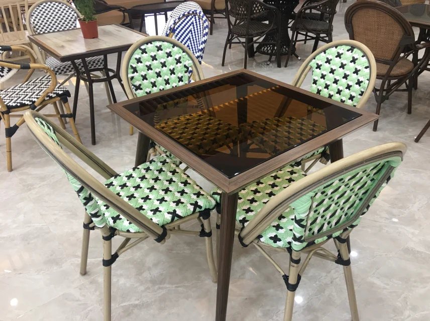 Main material | aluminum tube dia28*1.5mm, UV resistant PE flat rattan 8*1.3mm powder coating, bamboo look finish |