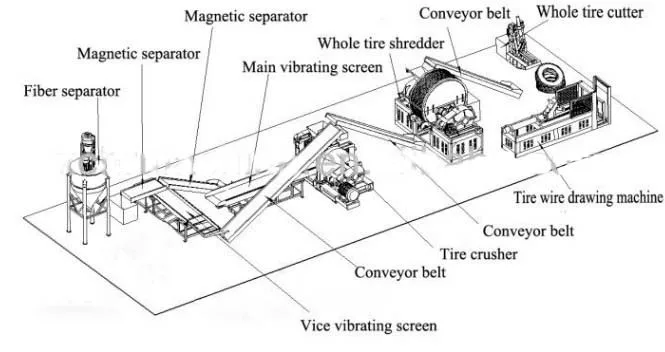 Waste tire - Tire de beader- whole tire cutting - tire shredder - Rubber crushing - magnetic separator - fiber separator - Rubber powder