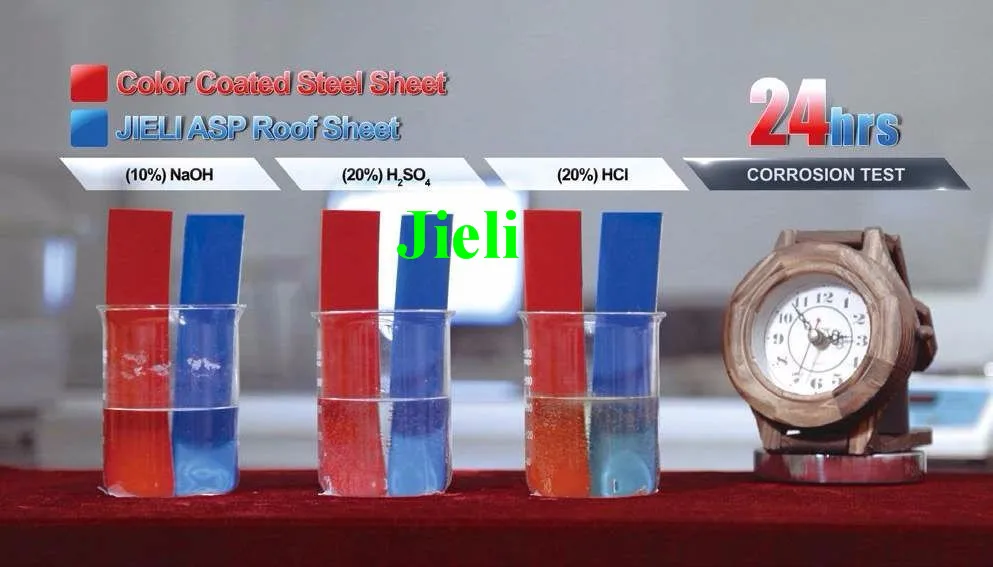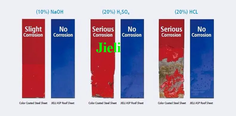 In order to confirm the corrosion resistance performance of ASP Steel Roof Sheet, our technician has done test as below:(In the test, the steel sheet and ASP roof sheet are put in the 20% sulfuric acid for 24 hours.)