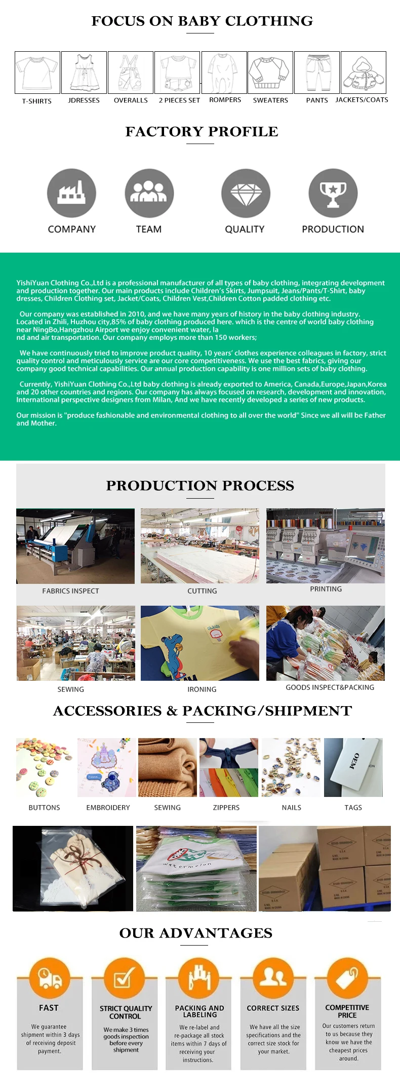 1. Are you treading company or factory? We are OEM Factory located in world children clothing city named after Huzhou, Our team have rich experience for design & productions. We supply you the most professional technical support and service. 2.How can you guarantee quality? We always make a pre-production sample before mass production, and always have final inspection before shipment. 3.Can you give me a discount? Our policy is for bigger quantity, lower price, so we will give you discount according to your order quantity. 4.Could I use my own LOGO or print my own design? Yes, OEM acceptable,Its our main work. 5.How does this product packed usually? One piece one polybag, also support customized with your own packaging. 6. Can you be our brand agent and help to broaden it? Yes, it’s ok. We can negotiate the detail. 7. Free sample or not? Yes. But need USD30 per pc/ color/ design first, and it will be deducted when mass order placed. Stocked sample, 1~2 days to be arranged. Customized sample, please contact sales to further negotiation.If VIP Customer, we support free sample from second order. 8. Do you have some stock items ? Yes, all hot products have stock. 9. Can you do OEM & ODM? Yes, we do. Such as customized color/ size/ fabric/ design. 10.Do you accept Secure payments? Of course. Paypal is OK for sample also,T/T L/C or credit card is for bulk payment. 11.Can we order 100 pieces for the first order if we are happy with the samples? Yes, 100 pieces with our design is OK, or MOQ is 500 pieces per design, muslin blanket basic. 12.How Can I visit your factory? Fly to Hangzhou, Then we pick up from airport.