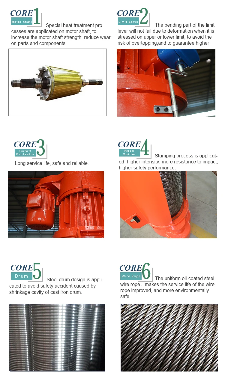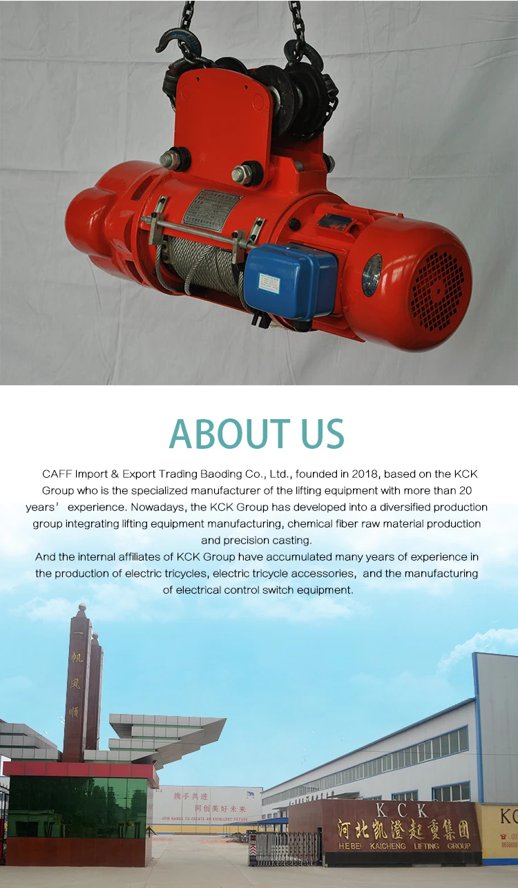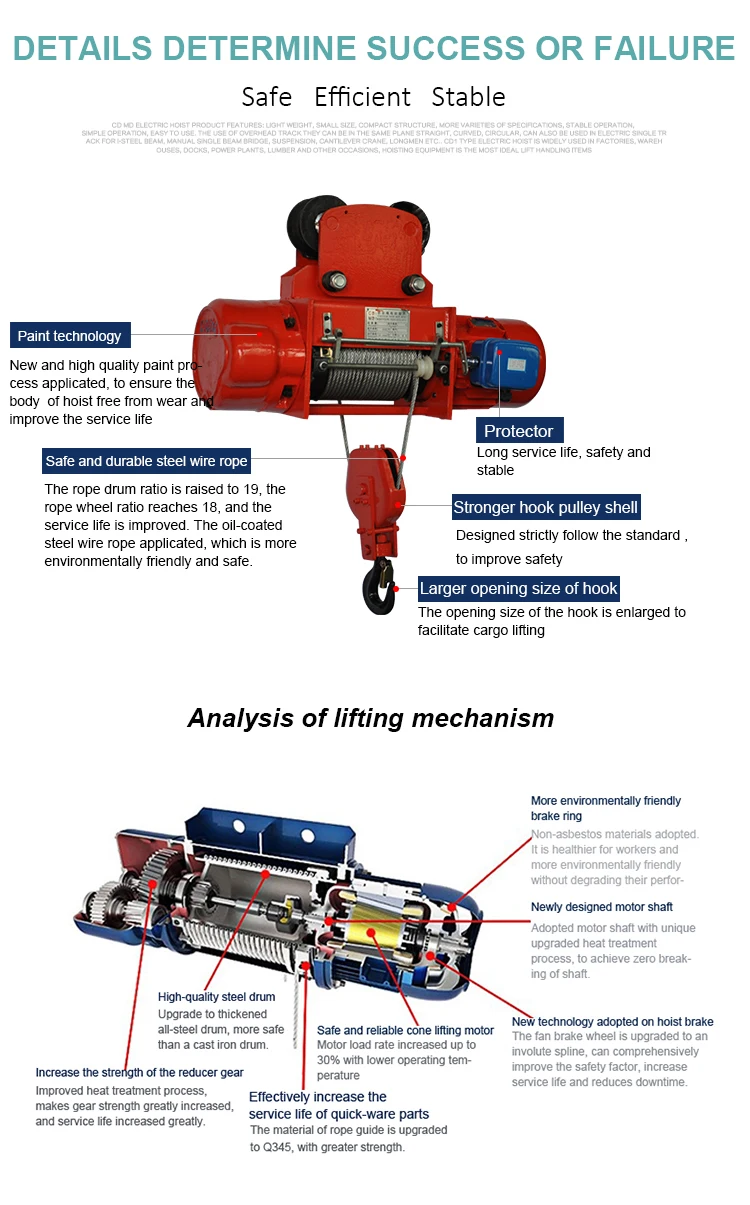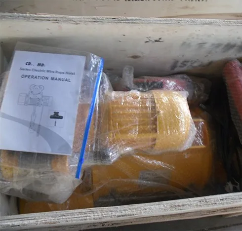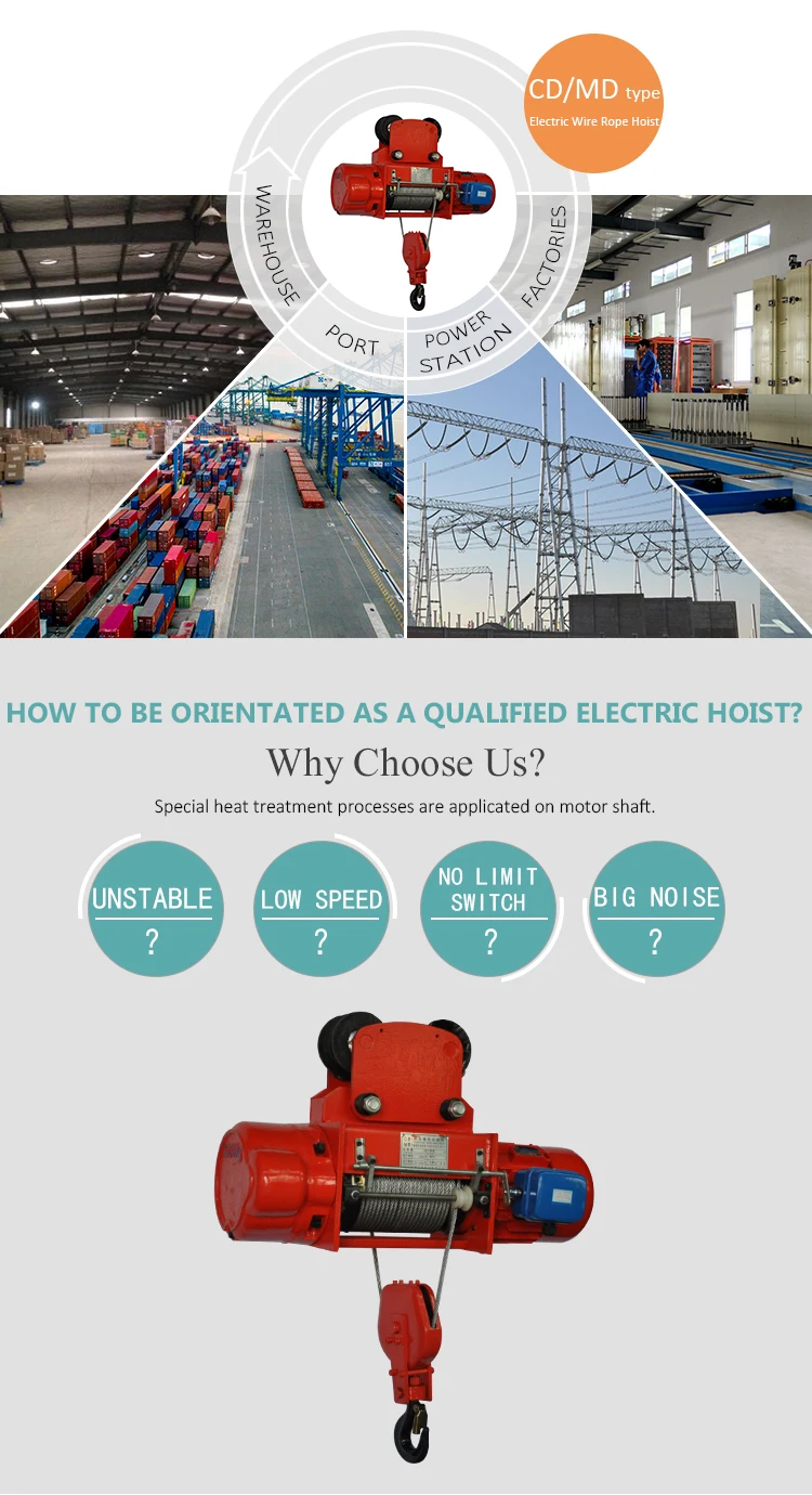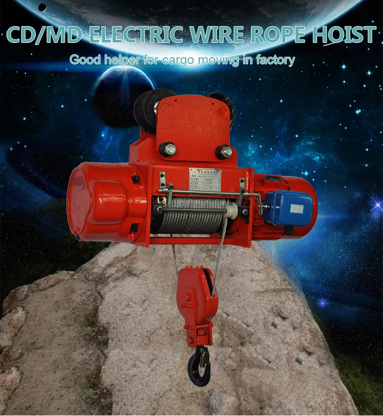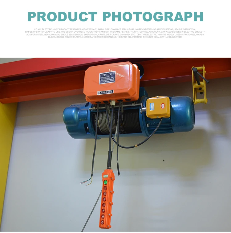 The electric wire rope hoist model CD and MD have the features of compact, light, small-size shape and smooth operation. It can be used not only on the overhead rails, but also be used in conjunction with many types of electric or manual cranes such as the single-girder crane, the double girder crane, the cantilever crane and the gantry crane. The electric hoist model MD1 with double lifting speed should be used in cases where the hoist model CD1 with single speed cannot meet the requirements for fine adjusting during precision operations.