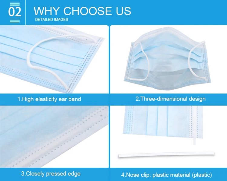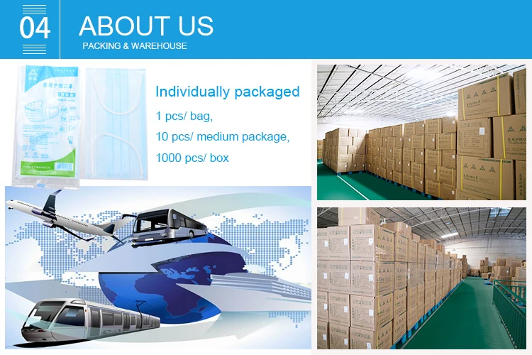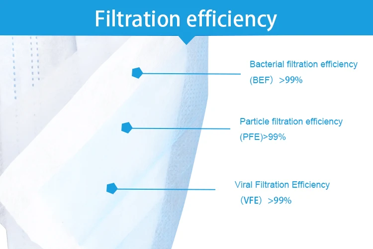 | Feature | 1.BFE:99%,PFE:99%, VFE:99% 2. Nose clip: plastic material (plastic) 3. Mask strip: not easy to break, large width 4. Breathable, Comfortable, Skin friendly |