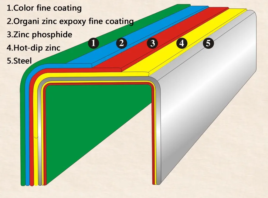 1.Color fine coating can help it increase its stability property ,prmanent anti-dirt and ability to self-cleaning its surface. 2.Organic zinc epoxy fine coating can help it increase its property to be resistant to erosion and against impacting. 3.Zinc phosphide can help the coating and basic materials more adhesive. 4.Hot-dip zinc can protect it electrochemically and keep its steel-iron basis materials from being rusty from its inside to the outer.