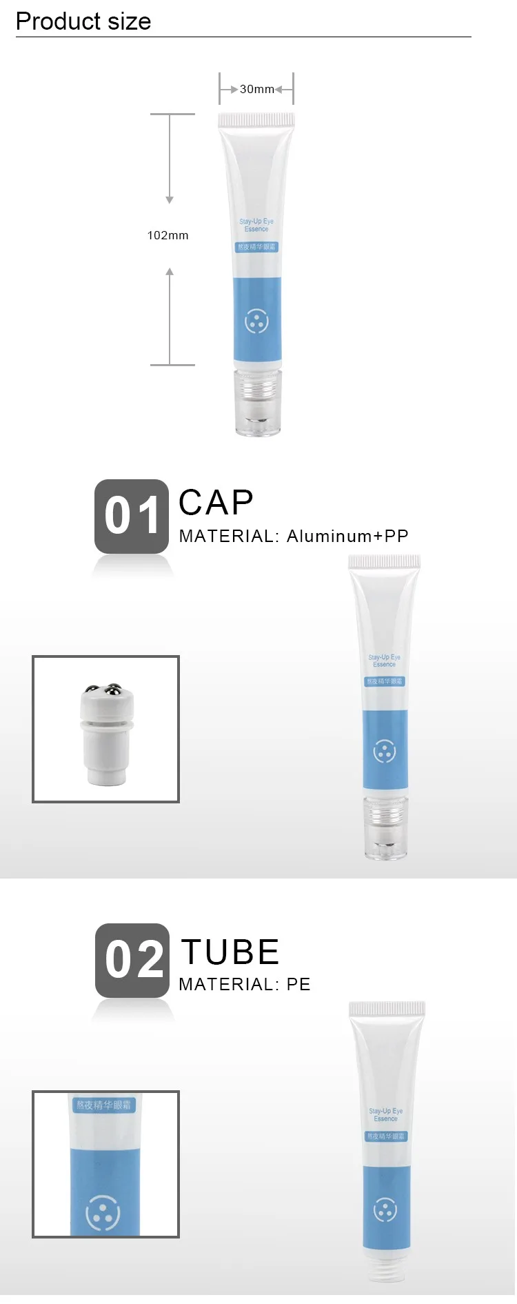 Product Name: | D30mm L100mm 20g Silkscreen Glossy Blue 3 Roller Ball Transparent Cap Stay-Up Eye Essence Gel Applicator Tube |