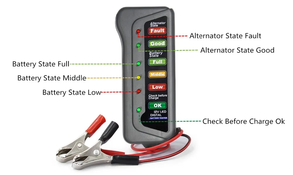 This battery tester, safe and easy to operate, has multiple functions: alternator state check, battery condition check, check before cargo and overload. Display, tell us the state alternator and battery, thus improving our driving safety.