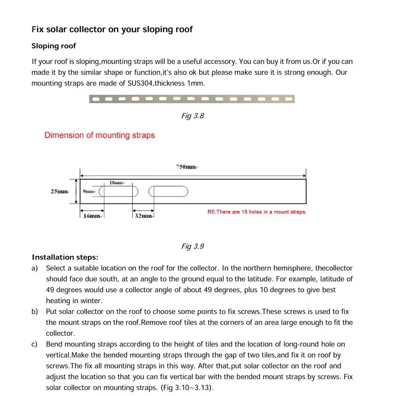 Roof straps are members that forms a fixed connection between the solar collector and the roof,it is suitable for types of inclined roof installations such as tile roofing, metal roofing and wooden roofing.Quick installation and very firm,does not change the roof structure, no leakage problems.