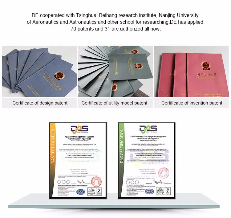 Jiangsu Digital Eagle Technology Development Co., located in Wuxi, which is a high-tech company with ability to develop fight control system. Now, DE has R&D departments in Wuxi and Suzhou, factory and service tems in Taizhang and Yancheng.