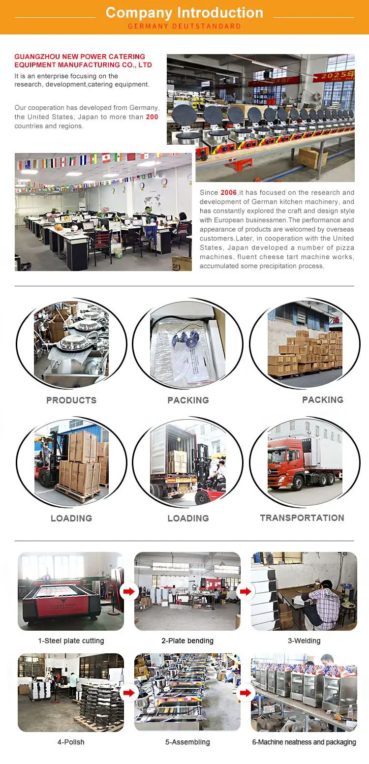 Guangzhou New power Catering Equipment Manufacturing Co.,Ltd is a one-stop western kitchen equipment supplier, integrating research, designing, production and sales activities into one. We have been devoting ourselves to applying easy-to-use and faster western kitchen equipment solutions. We have a big coverage of cooling, heating and normal temperature equipment for food processing and preservation. we are happy to welcome trading companies from all over the world.