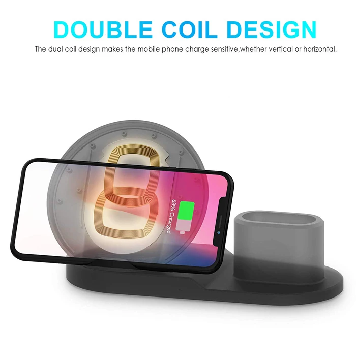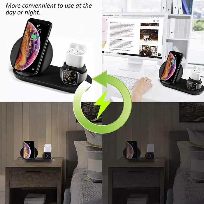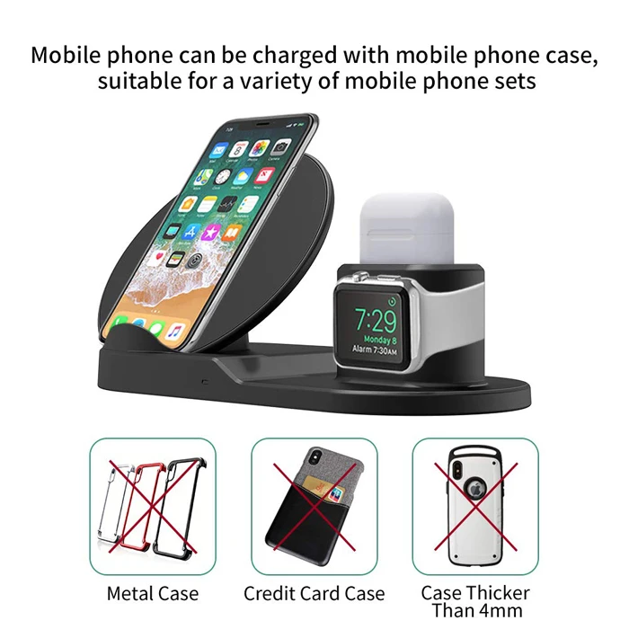 Function | 1. The 3 in 1 wireless charging station can reduce your charging cable on your desk for different devices, only need one cable, save place and look neatly. 2. Charge your qi-enabled Smartphones/for iWatches/for Airpods 3. Three wireless charging mode for your phone: 10W, 7.5W, and 5W. 4. Made of premium material, keep your devices away from scratching. 5. Built-in intelligent indicator shows you charging status. 6. Easily install and conveniently to use. 7. Weight: 0.34 lb |