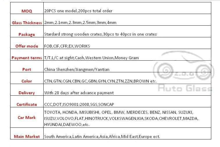 Z.D.G: We can supply front windshield,rear windshield,side window glass and Glass sealants etc.
