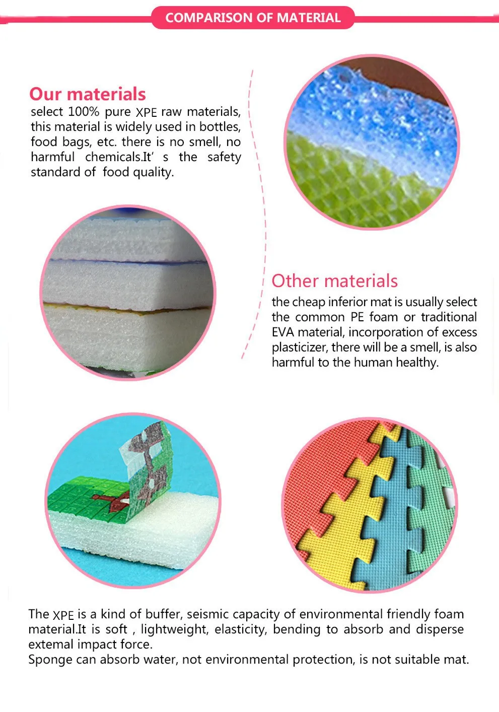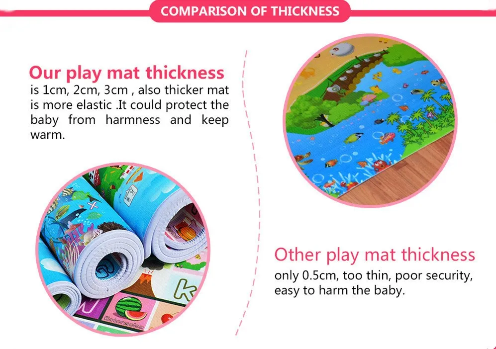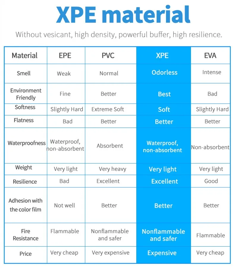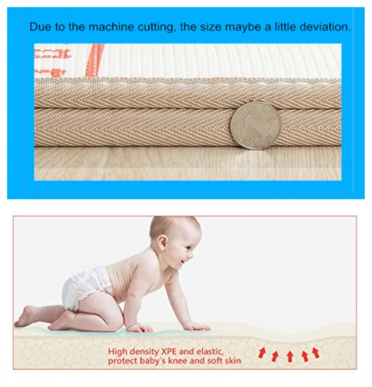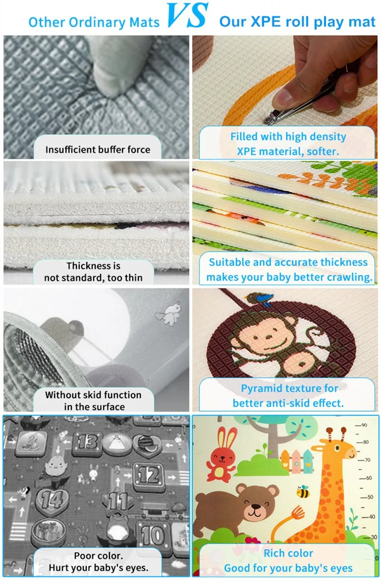 With the new material appear, old material is always obsolete. With XPE is popular now, we don't use EVA or EPE any more. Because is is not eco-friendly and a little toxic for babies. Our XPE foam durable popular thick infant play mat is a relative better product nowadays. And our thickness is 1.5cmor 2cm, for baby who is learning crawling, it is a very good choice. And we promise we only use safe non toxic non odor product to produce our play mat.