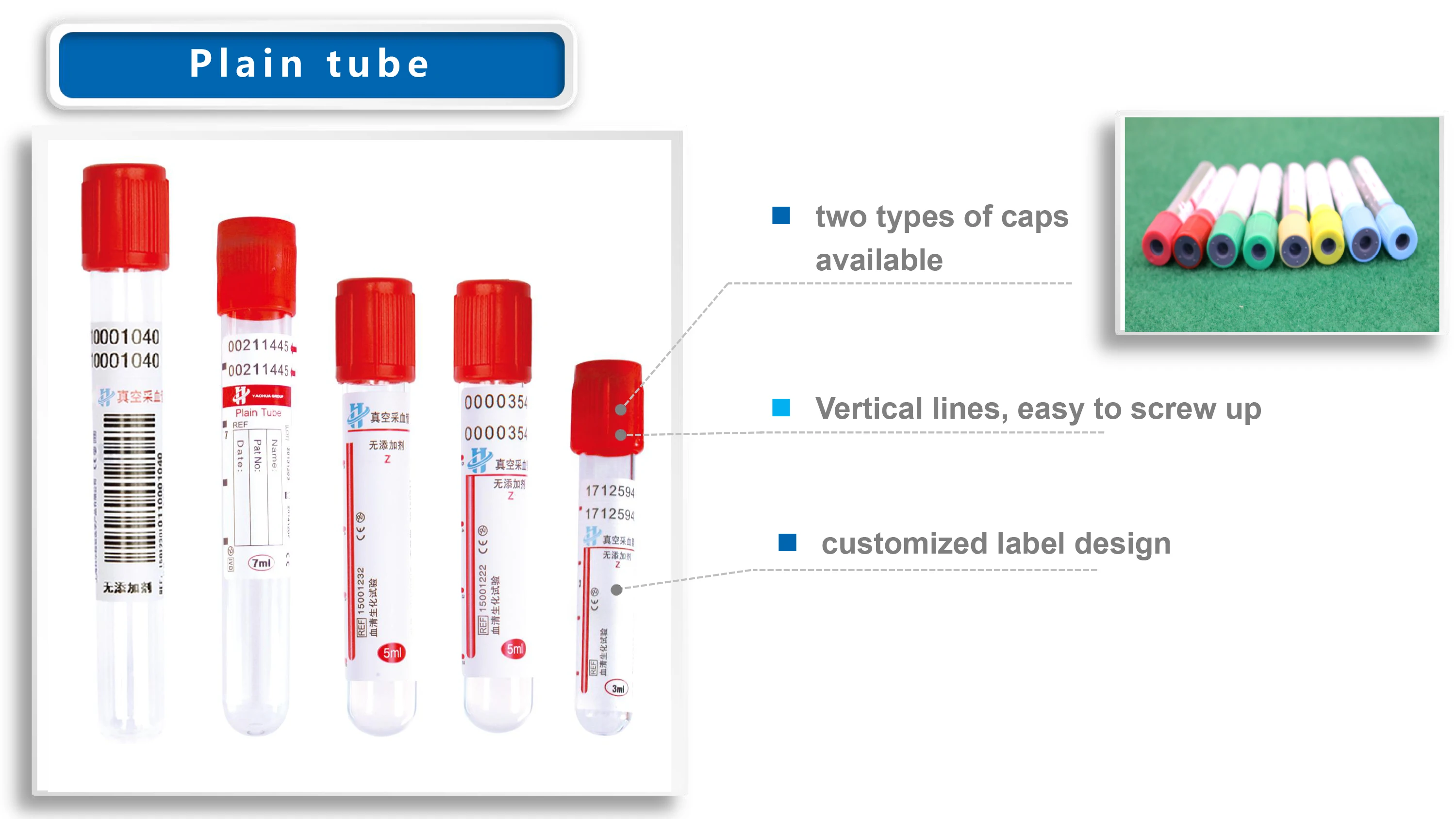 Item | Cap color | Additive | Tube size(mm) | Tube material | Blood volume |