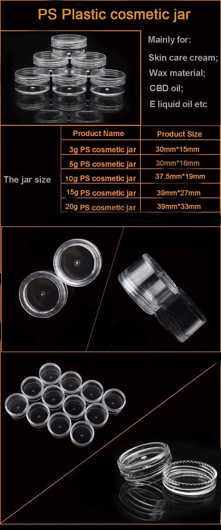 Wholesale 2.5g 2.5ml 3g 3ml 5g 5ml 5cc 10g 10ml 15g 15ml 20g 20ml 25g 25ml 30g 30ml 10 ml Plastic Round Sample Jar with Lids in bulk stock, so we can delivery in 12-48hours after we get your payment, pls click "send" for your inquiry.
