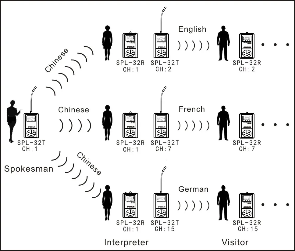 Interpreters can monitor the spokesman by wireless receivers and then their transliteration were emitted by other wireless transmitters.