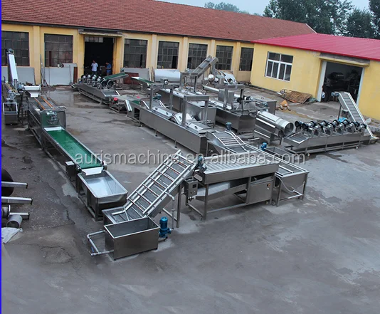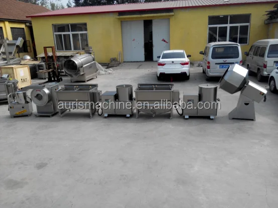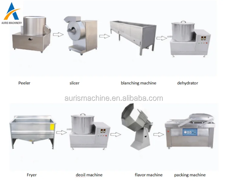 1.peeling and washing machine To remove skin of potatoes and clean 2.slicing and cutting machine To cut peeled potatoes into slices or strips 3.blanching machine To remove extra starch and protect color 4.dehydrator machine To remove extra water before frying 5.oil-water mixture frying machine To fry chips/strips with low waste 6.de-oiling machine To remove extra oil of fried chips/fries 7.seasoning machine To season chips/fries to different flavors